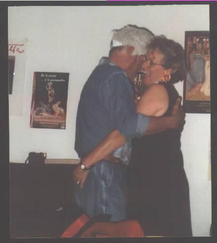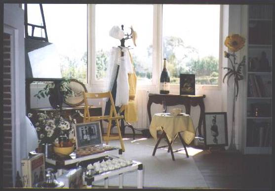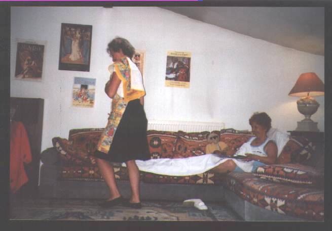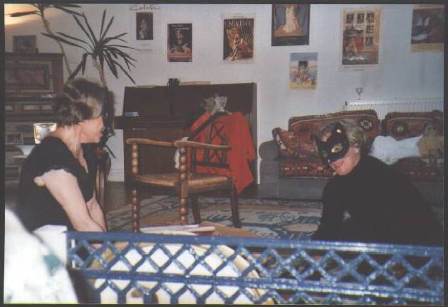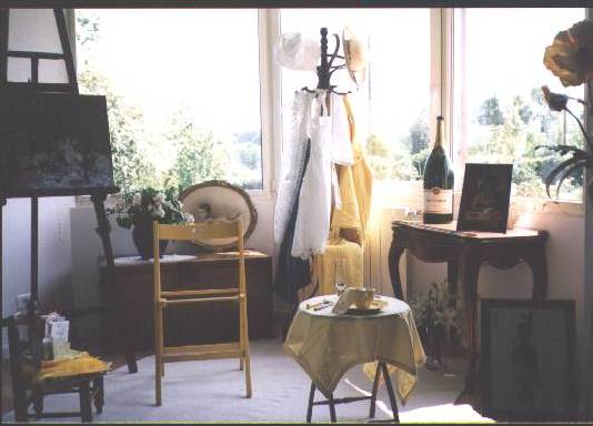 Je fus également invitée (en mai 2001) à une prestation privée chez mes amis Chantal Baudoin et Gérard Gros, dans leur fort jolie maison campagnarde. J'avais carte blanche quant à mon programme, et je choisis, comme au Havre, d'évoquer des souvenirs d'enfance. Je n'avais pas lésiné sur le décor (en partie comestible) évoquant la pâtisserie de mes parents. Dans le berceau de mes poupées, on remarquera mes chers ours Popof et Michou, que je fis dialoguer dans une classe de Fleury-sur-Andelle (voir Conversation dans les textes de la rubrique ateliers d'écriture)