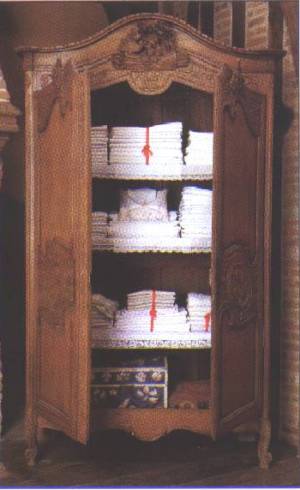 Dans ce pays-ci, l'armoire est le symbole de la richesse des filles. Ce ne fut donc pas une mince affaire que décider du décor de mes portes. Mettrait-on des colombes, des épis de blé, des cornes d'abondance ? Quand enfin on tomba d'accord (le père tenait aux épis, la fille aux colombes), il y eut de nouvelles discussions - avec la mère cette fois - pour le trousseau. Combien de draps, de torchons, de nappes, de serviettes ? Et, surtout : quelle qualité ? Quel type de broderies pour le chiffre ? Quelle quantité de jours de Venise ? J'avoue avoir perdu le fil de ces conversations, faute de posséder tout le vocabulaire technique, mais je regrettais cependant, une nouvelle fois, de n'être pas taillé en porte-plume, pour rédiger un opuscule sur la symbolique des objets. Enfin, on m'emplit de linge jusqu'à la gueule (pardon : jusqu'à la corniche. Ma longue cohabitation avec les hommes m'entraîne parfois à pratiquer l'anthropomorphisme lexical). Et la jeune fille déposa des sachets de lavande entre les piles de toile neuve.