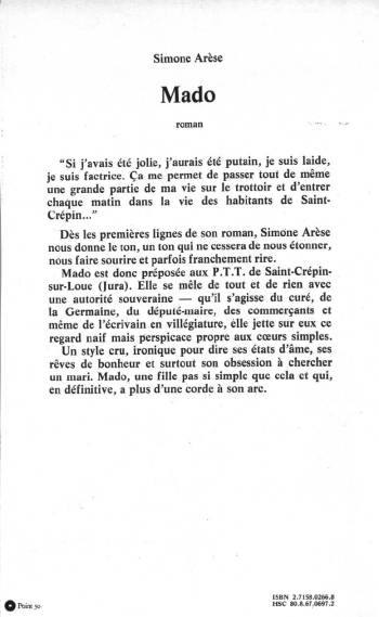 Les occasions de franche gaieté se raréfiant avec la morosité du temps, il faut profiter de la bonne farce que raconte Simone Arèse, avec « Mado », l'histoire cocasse d'une « jeune pucelle sans grâce et plutôt innocente, préposée aux P.T.T. à Saint-Crépin-sur-Loue ». Ce n'est pas un récit féministe dans le ton des romans de Catherine Rihoit ou Chantal Chawaf. On ne s'extasiera pas sur « l'exquise délicatesse de l'analyse des sentiments contradictoires d'une célibataire au cœur brûlant ». « Mado » c'est, dans un décor de « Clochemerle », la solitude racontée à la manière de Patrick Cauvin. Canular au premier degré, réflexion sur le bonheur quotidien, au second.